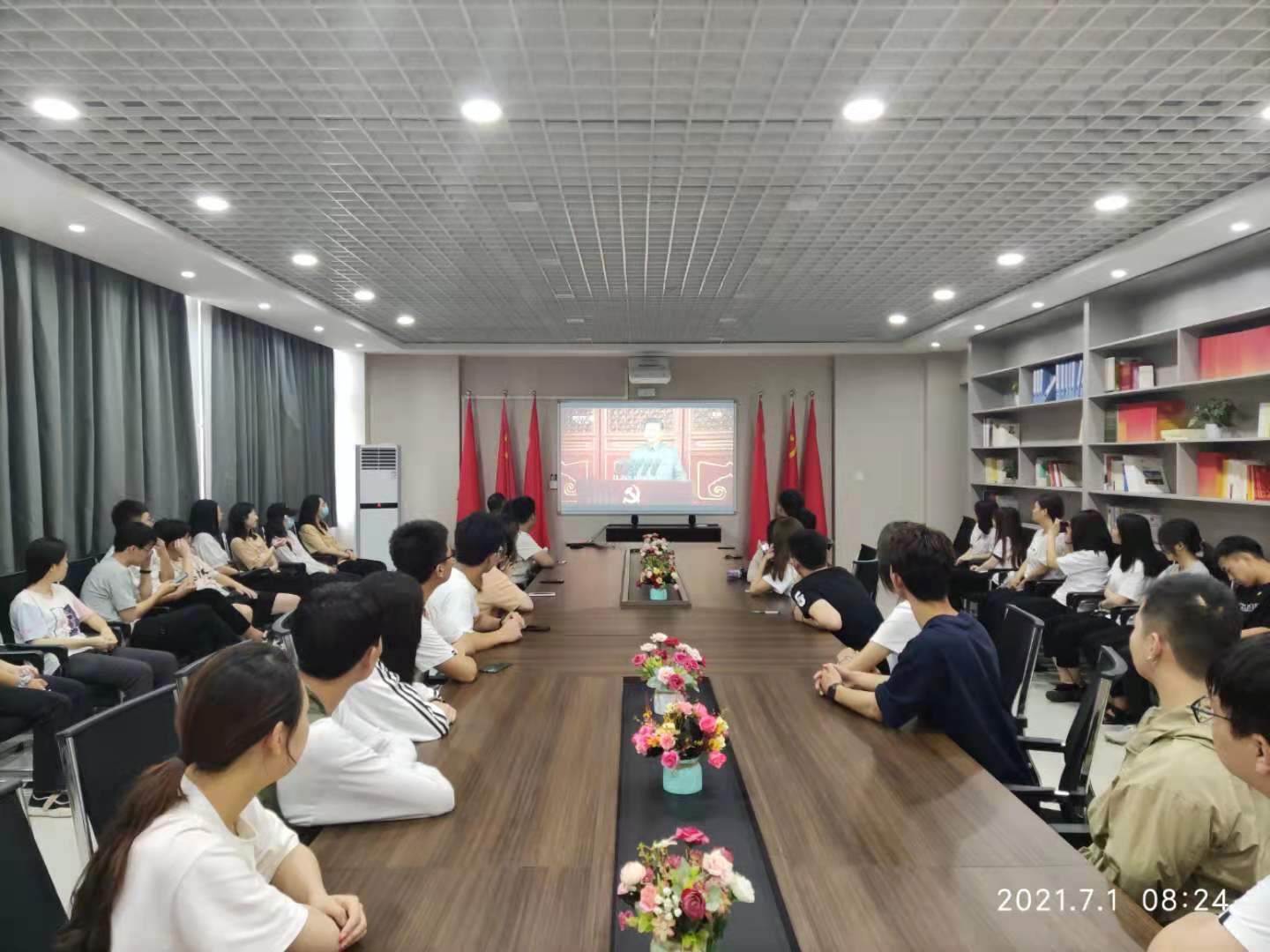 2021年7月1日,我院组织部分师生党员在3号楼911会议室观看建党100周年庆典。各党支部同时组织其他党员自行观看,并进行线上交流。