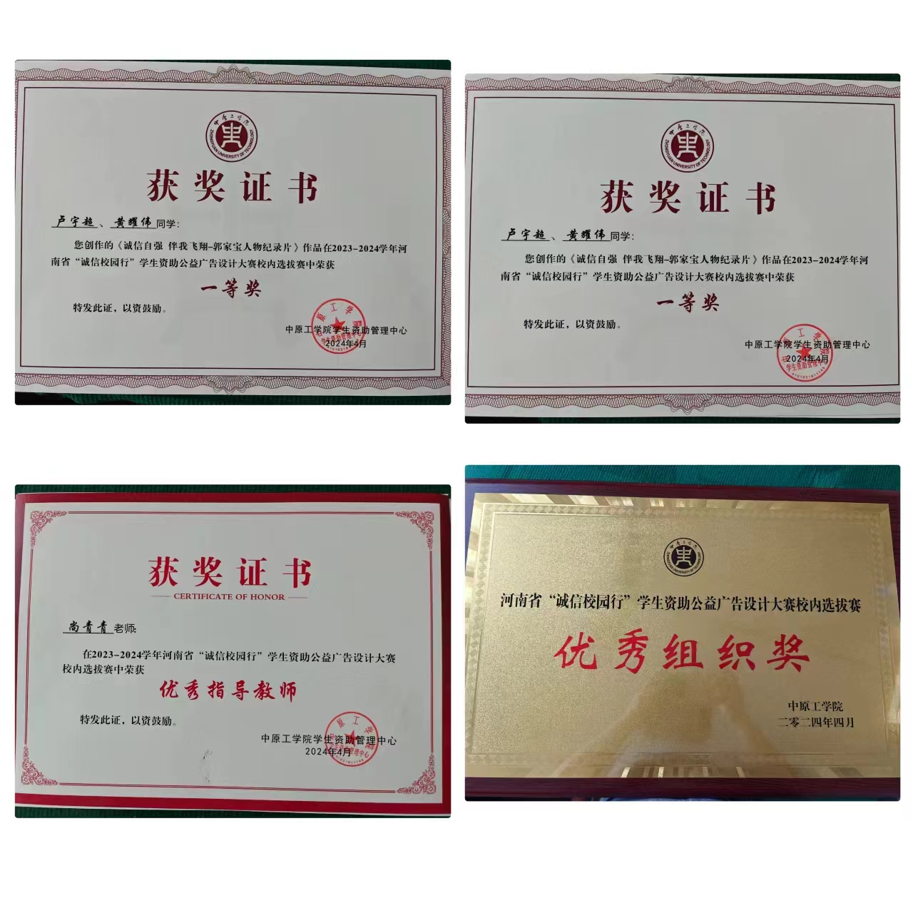 由尚青青老师指导的,卢宇超和黄耀伟制作的视频《诚信自强伴我飞翔-郭家宝人物纪录片》获得了视频类一等奖;