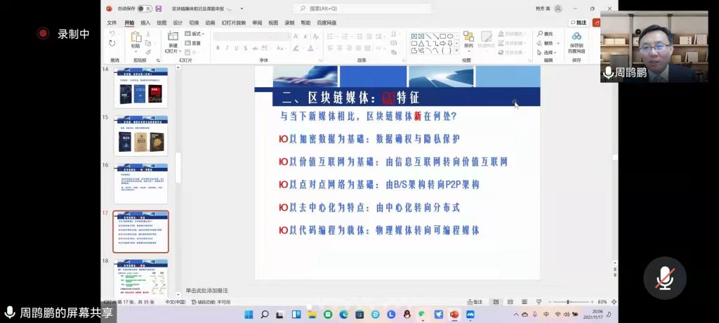报告中,周鹍鹏教授结合国家对区块链技术的战略需求,从区块链媒体和区块链媒体科研项目申报两个方面,详细解读了什么是区块链和区块链媒体,梳理了区块链媒体是以加密数据为基础,进行数据确权与隐私保护;以价值互联网为基础,由信息互联网转向价值互联网;以点对点网络为基础,由B/S架构转向P2P架构;以去中心化为特点,由中心化转向分布式;以代码编程为载体,由物理媒体转向可编程媒体五个方面的特征。