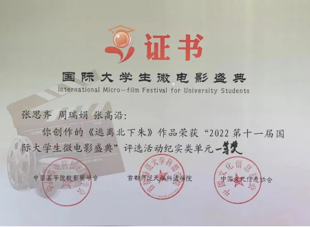 2023年4月8日上午9时,第十一届国际大学生微电影盛典在北京首都师范大学大学生活动中心如期举行。由我校新闻与传播学院高冬可老师指导、广播电视学专业2017级学生张思齐、周瑞娟、张高沿创作的毕业作品《逃离北下朱》在参赛的国内外共5900余部作品中脱颖而出,荣获纪实类单元一等奖;高冬可老师同时荣获了最佳指导老师奖。